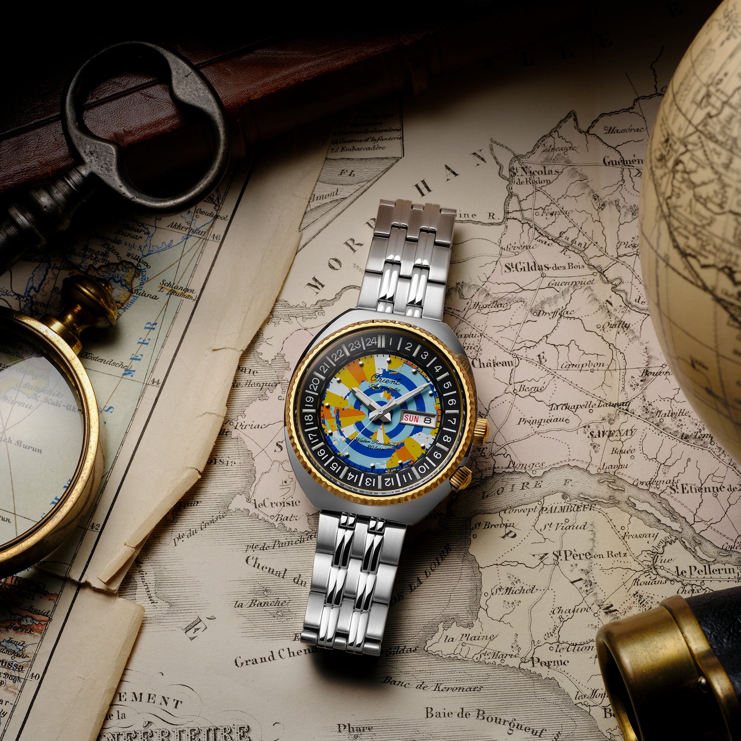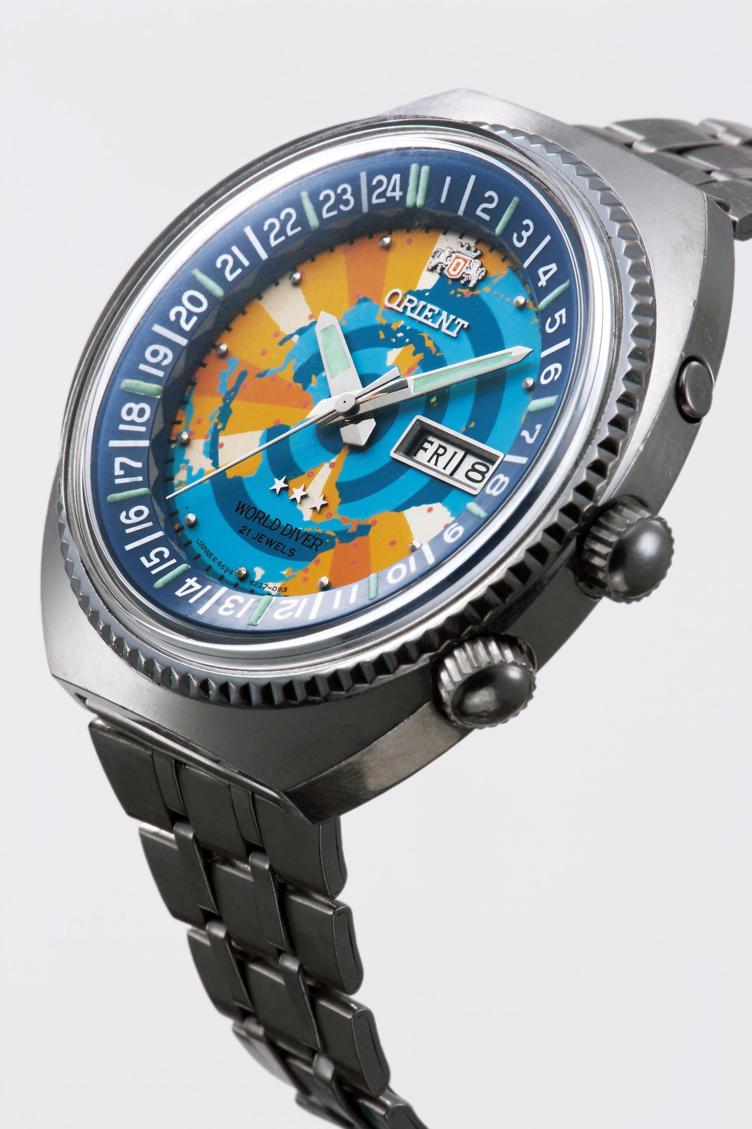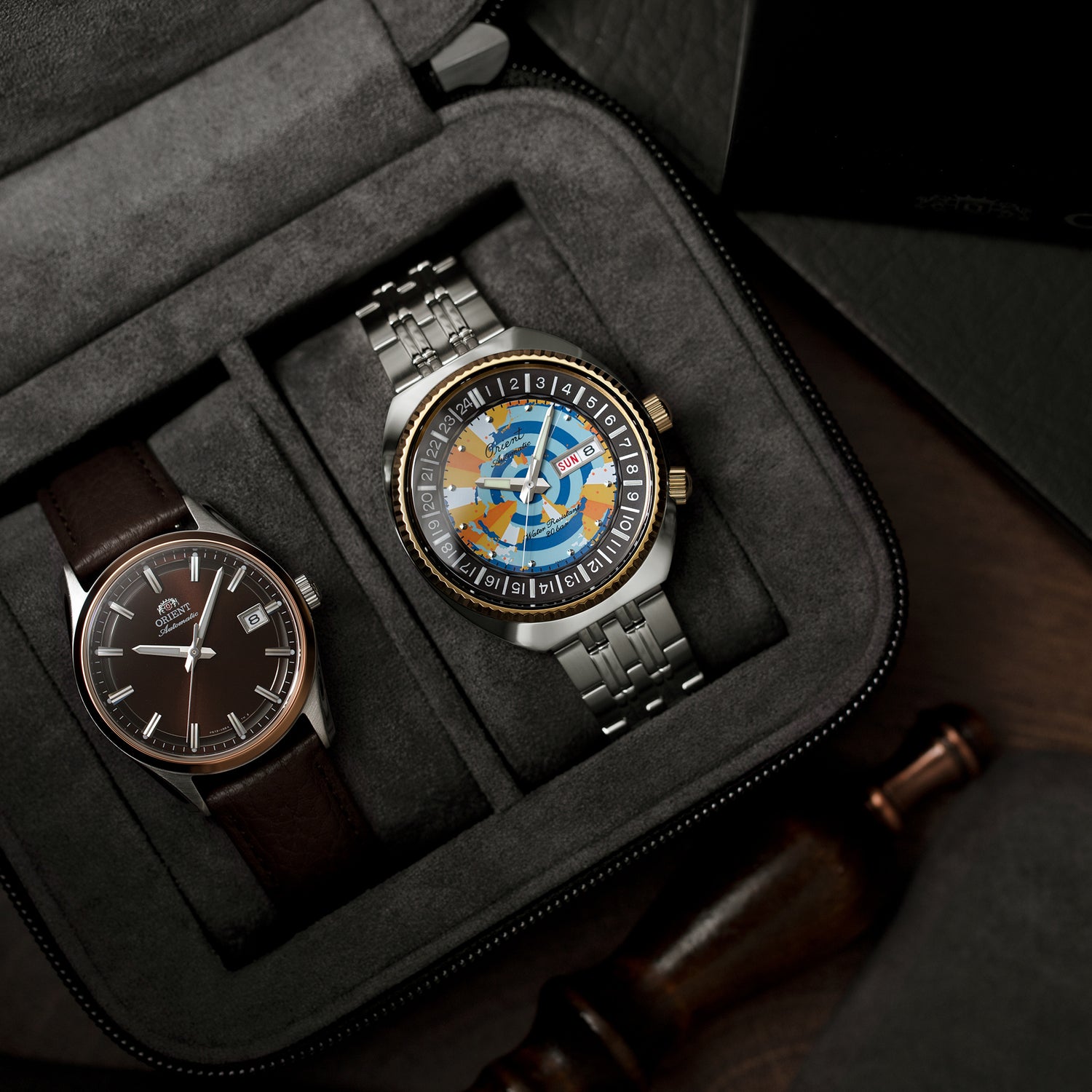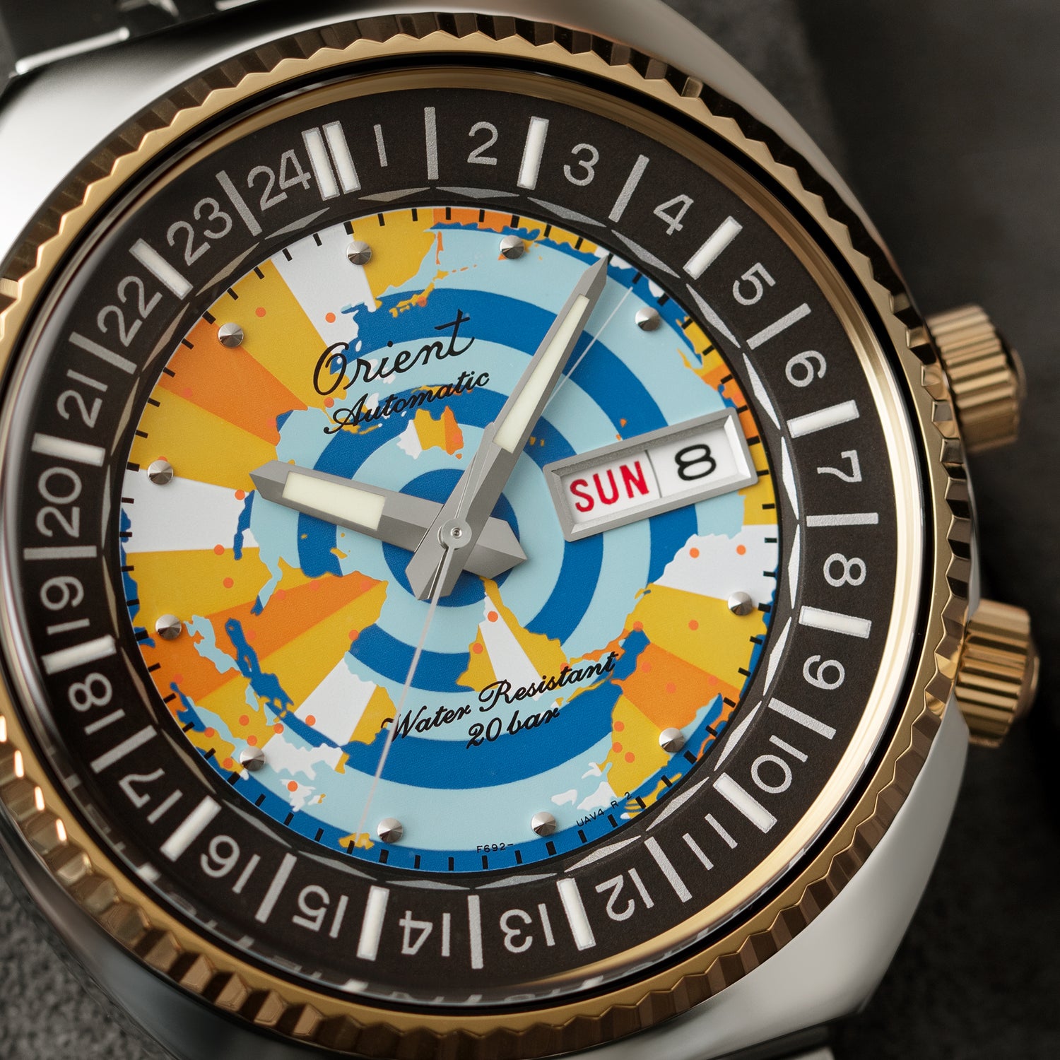 這款腕錶充滿復古韻味,是 Orient 歷史底蘊與時代精神的完美體現。其設計靈感源自1969年發表的 WorldDiver 腕錶:一款融合潛水功能與世界時間顯示的創新之作。而 World Diver 則是1964年 Orient 極為稀有的Calendar Auto Orient Swimmer World Trip的延伸復刻版本。值得一提的是,1964年正是日本政府首次開放國民自由出國旅行之年,此錶所搭載的簡易世界時區功能,象徵著當時日本社會對國際旅行的嚮往。