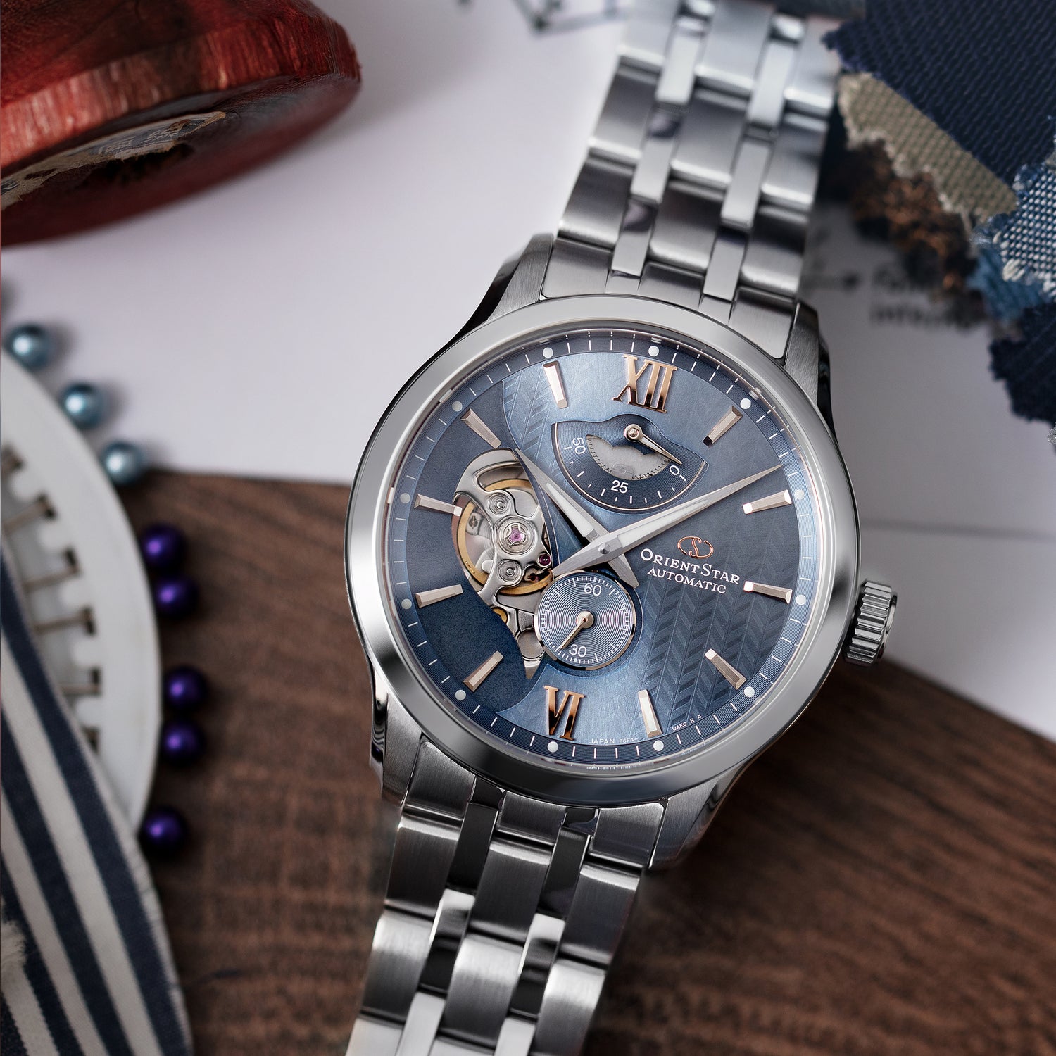 在錶款外型上,紡織主題不僅運用於錶盤設計,還延伸到錶耳的柔和曲線,使人聯想到織物的垂墜感。此外,雙曲面藍寶石錶鏡與抗反射鍍膜不僅增強了錶盤可讀性,也與錶款的獨特設計互相輝映。錶款搭配的五片式短鏈節金屬錶帶,更為佩戴者帶來舒適的觸感與優雅氣息。RE-AV0B08L與RE-AV0B09N錶款搭載的F6F44自動上鍊機芯,可為腕錶提供50小時的動力儲備與穩定的高精確度,兩款錶款皆可透過鏤空機芯錶背設計,一探Orient Star錶款的動力儲備構造與細緻的機芯工藝。