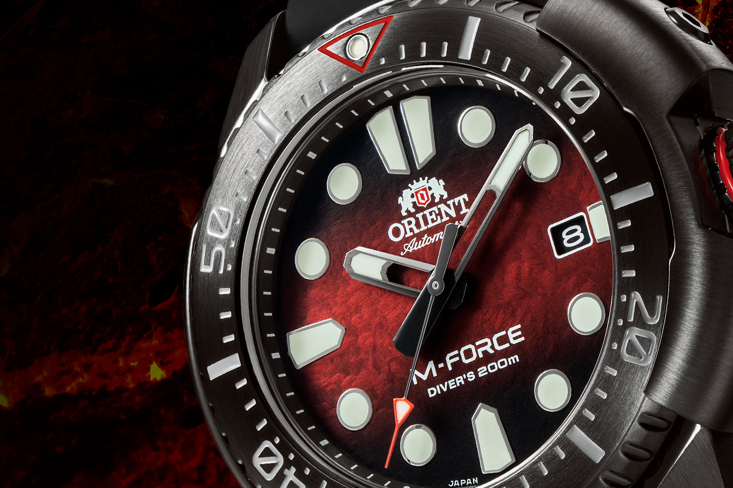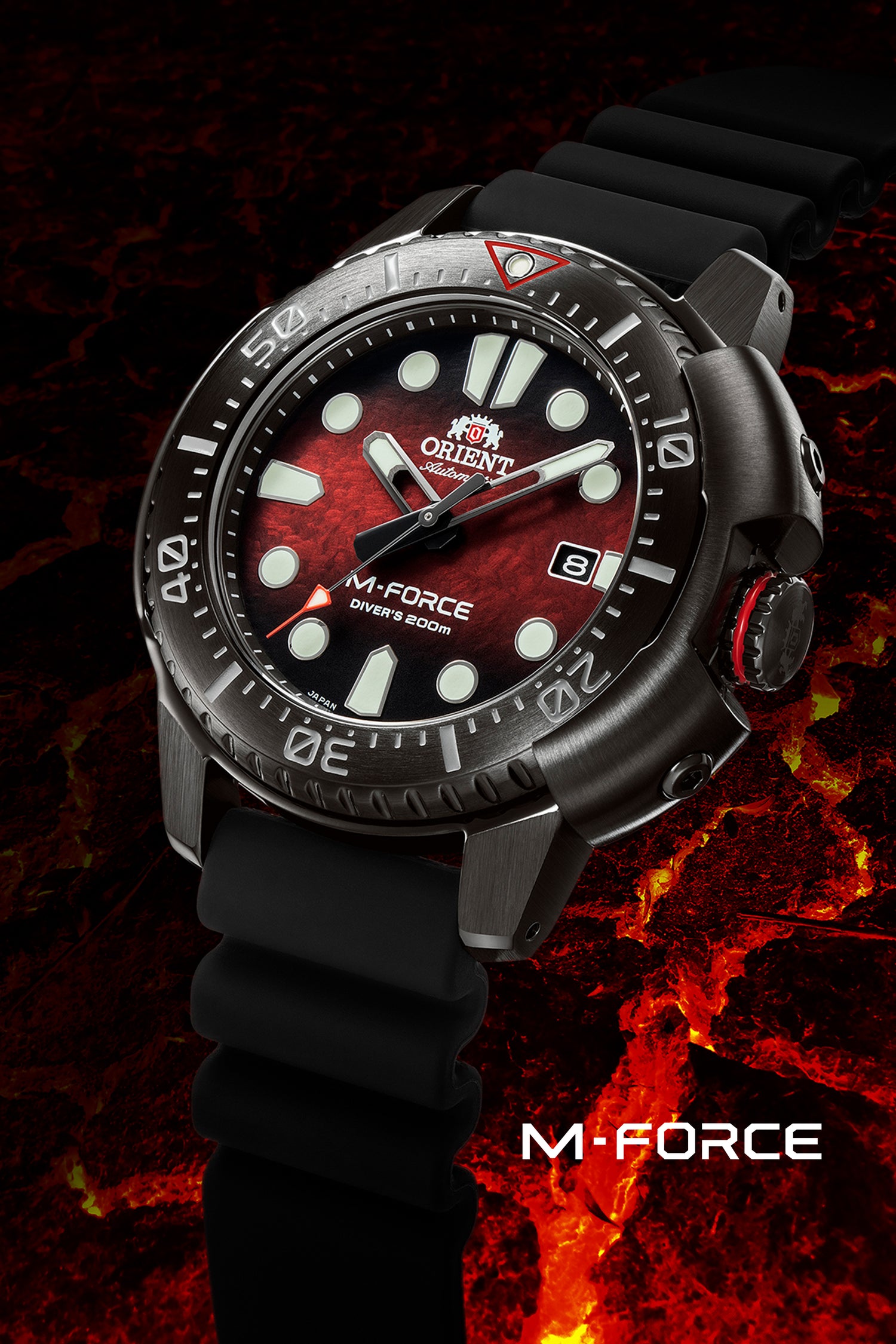 全新M-Force系列潛水機械錶,符合ISO6425認證標準,防水壓力等級達200米。錶面皆採用具備SAR防反射鍍膜塗層的藍寶石水晶玻璃鏡面,時間刻度則採立體感十足的浮雕設計,並具有夜光塗層,即使在光線微弱的深海中也能維持出色的能見度。搭載F6727日本機械機芯,具自動、手動上鏈及停秒功能,充分展現配戴實用性。除此之外,於3點鐘位置配有潛水錶特有的螺旋式錶冠,可有效強化錶款的防水功能,錶冠外部的護肩設計,大幅降低錶冠及錶圈在水面下因受到外部壓力或強力衝擊而損壞的情況發生,提供配戴者在水面下最安心的保障。Orient M-Force系列潛水機械錶,由內而外採用多項防震保護裝置,以確保潛水愛好者在水下也能精準掌握時間。