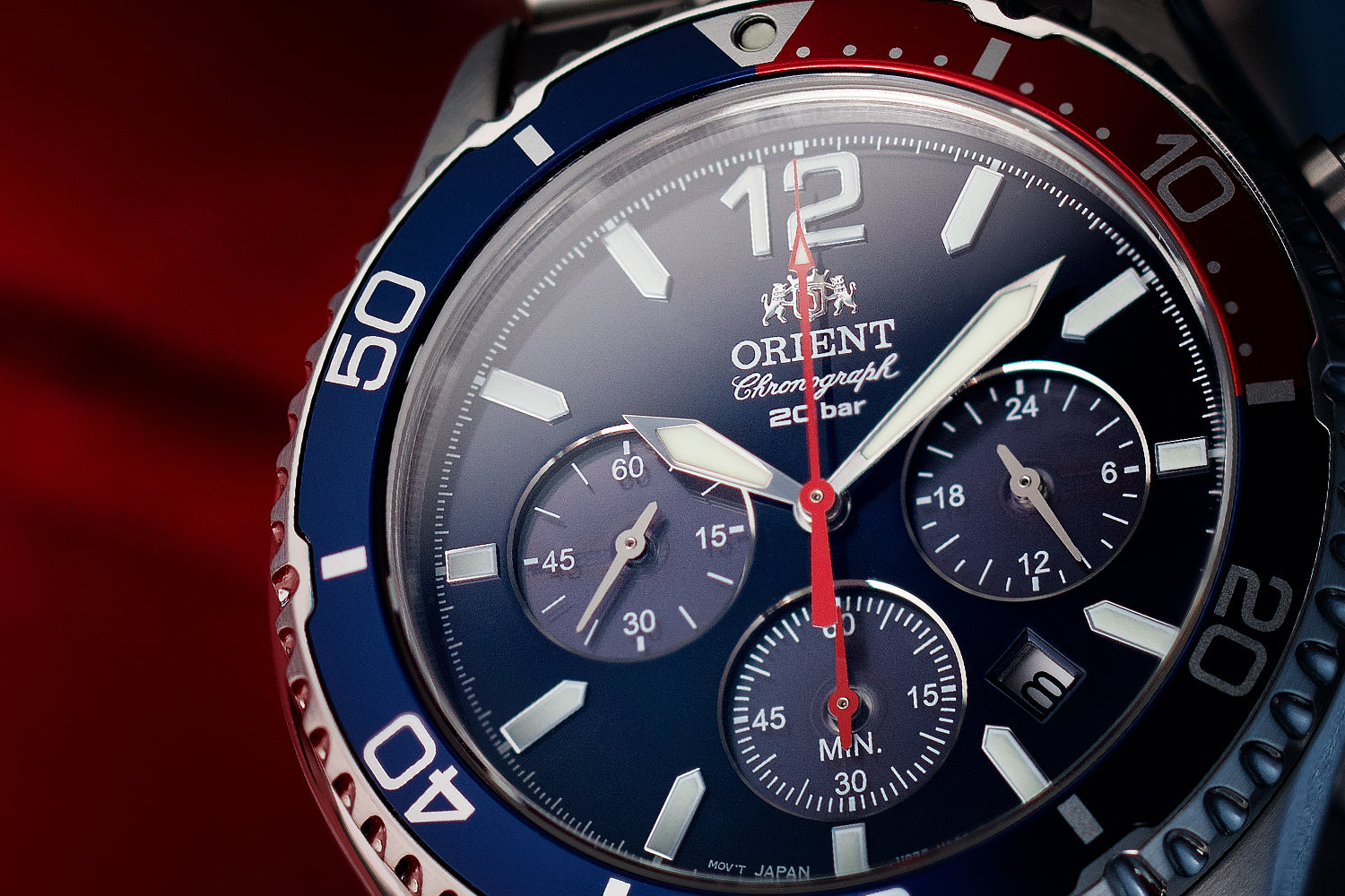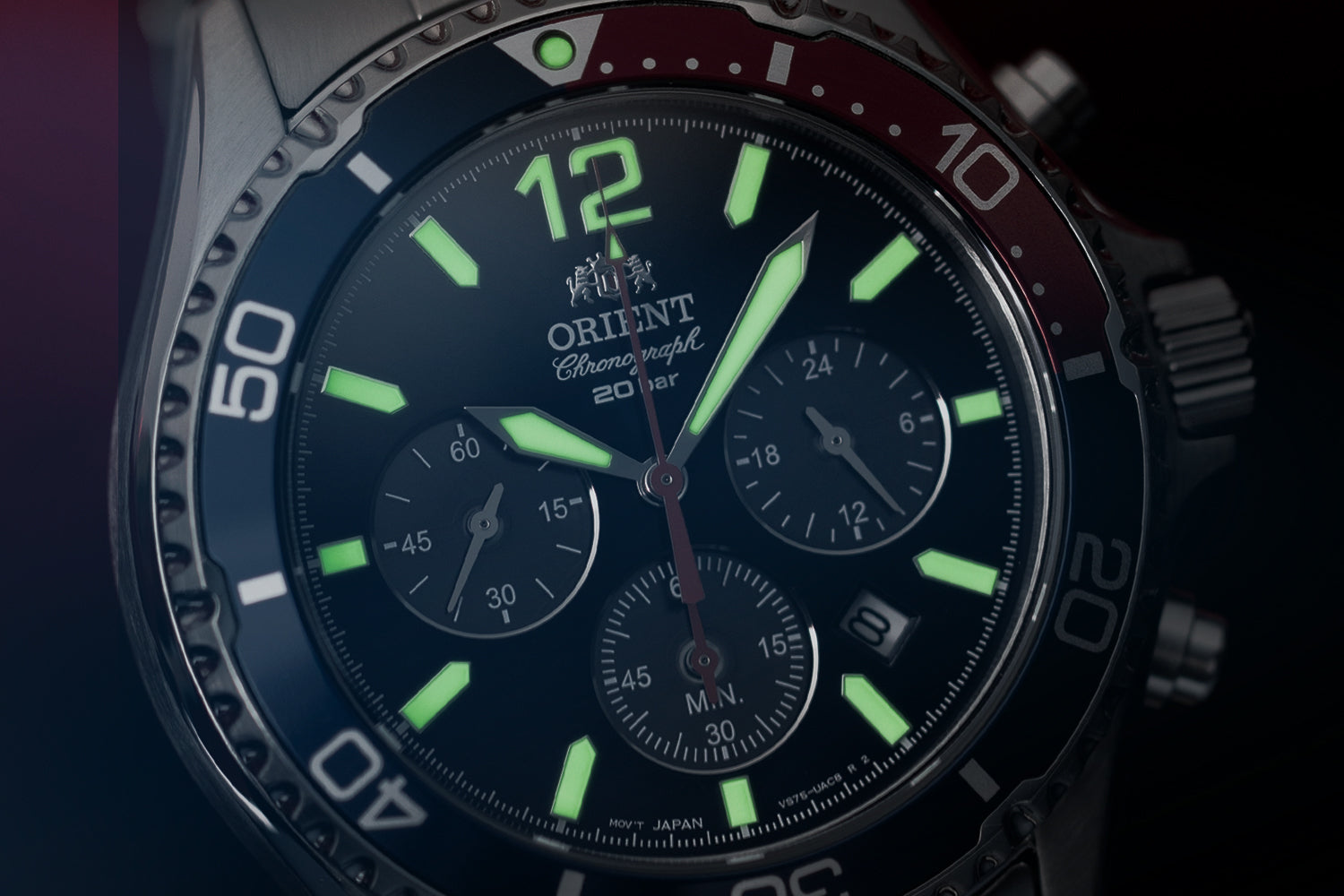 Orient東方錶新推出的太陽能計時錶款,沿襲潛水系列的特殊單向旋轉錶圈和六個凹槽的經典設計;在細膩具有光澤的錶盤上附有三個子錶盤,分別為3點鐘位置的24小時顯示窗格,6點鐘位置的60分鐘計時器以及9點鐘位置的小秒針子錶盤,並透過三個子錶盤接受太陽能電能;12點鐘位置處採用的阿拉伯數字時標,則是致敬第一代潛水風格錶款的設計;而全錶款皆使用夜光指針與時標,讓配戴者即使在黑暗中也能清楚辨識時間。